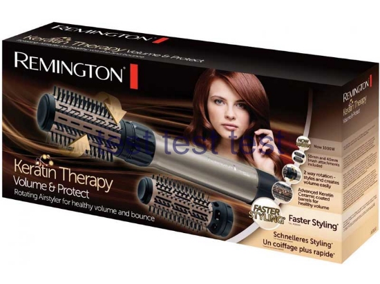 «کراتین» (Keratin) پروتئین تشکیلدهندهی ساقهی موست که باعث شادابی و خاصیت ارتجاعی مو میشود. در افرادی که موهای فر یا وز دارند، این پروتئین به اندازهی کافی برای نرمکردن ساختمان مو وجود ندارد. همچنین استفادهی زیاد از مواد شیمیایی مانند رنگ مو، ژل و تافت و براشینگهای مکرر با سشوار و اتو موی داغ، کراتین مو را از بین میبرند. کراتینهکردن مو یکی از روشهای بازگرداندن حالت لختی موست که البته به علت استفاده از حرارت زیاد و مواد شیمیایی مضر توصیه نمیشود. یکی از ویژگیهای سشوار Remington AS8110 خاصیت کراتین درمانی آن است. روی قسمتهای فلزی برسهای سشوار توسط «سرامیک کراتین» پوشش داده شده است. هنگام آرایش موها، ذرات ریز کراتین به ساقهی مو مهاجرت میکنند و موجب تغذیهی مو میشوند. به این ترتیب بعد از خشکشدن موها الکتریسیتهی ساکن روی ساقهی مو جمع نمیشود و موها کمتر وز میشوند. کراتین باعث صاف و براقشدن موها شده و حالتی زیبا به موها میدهد.
